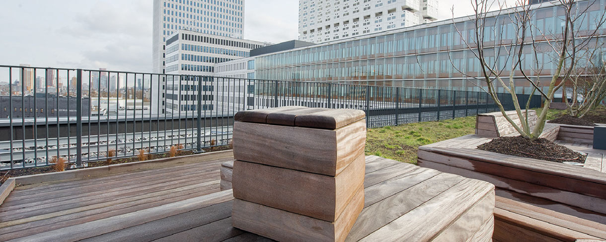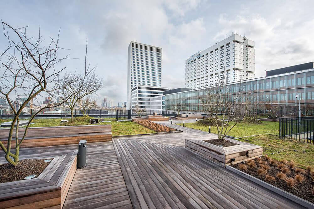 Im Jahr 2009 startete Erasmus MC ein großes Neubau- und Renovierungsprojekt mit dem Ziel, bestmögliche Ergebnisse in der Pflege erzielen zu können. Den Patienten dabei in den Mittelpunkt zu stellen, das war eine wichtige Speerspitze während des gesamten Entwicklungsprozesses. Nach einer enormen Kraftanstrengung konnte das neugestaltete Krankenhaus 2018 in Betrieb genommen werden. Das Gebäude ist dabei besonders effizient angelegt und bietet jedem Patienten ein eigenes Zimmer. Nachhaltig und mit viel Komfort ist das Erasmus Medisch Centrum nun für die Zukunft bestens gerüstet. Eine Dachterrasse mit Terrassendielen und Bänken aus nachhaltigem FSC®-zertifiziert Hartholz schafft dafür eine wichtige Vorraussetzung. Das Endergebnis ist ein außergewöhnlicher Ort samt wunderschönem Blick über die Stadt. Hier erfahren die Patienten viel Ruhe und Entspannung.
