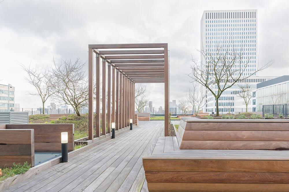 Eine sonnendurchflutete Dachterrasse auf dem Erasmus MC in Rotterdam, dem größten Universitäts-Klinikum der Niederlanden. Die Patienten können sich mit dem eigenen Bett nach draußen begeben und so die Natur und die ansprechende Skyline genießen. Bei diesem Projekt wurde das hochwertige Cumaru-Hartholz aus dem tropischen Teil Südamerikas verwendet. Dank der Robustheit und der langen Lebensdauer, eignet sich Cumaru-Holz besonders gut für Außenbereiche wie zum Beispiel Dachterrassen. Weitere Informationen zur Verwendung von Holz für Dachterrassen finden Sie übrigens unter unseren Projekten für Holzdachterrassen.