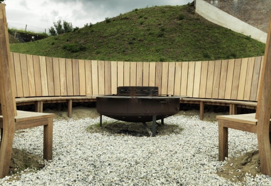 Ein sehr ansprechendes Design einer Außenbank inklusive Feuerstelle inmitten des Ateliers van Corven.