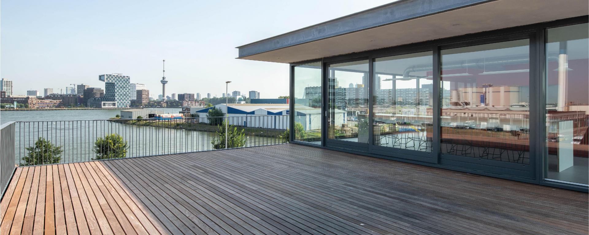 Eine Schiebetür bietet dabei den Zugang zur Dachterrasse mit edlem Holzboden. Die Aussicht ist durch das neue Stockwerk noch großzügiger geworden: Durch die neue Etage können Mitarbeiter wie Kunden nicht nur die Nieuwe Maas samt Skyline von Rotterdam auf der Nordseite bewundern, sie können jetzt auch auf die Waalhaven an der Südseite blicken. Die Dachterrasse wurde von Cumaru-Holz versehen. Die Bretter sind glatt und auf eine Größe von 21x90mm gehobelt. Die Holzart wird künftig sehr gleichmäßig und mit einem schönen Resultat altern.