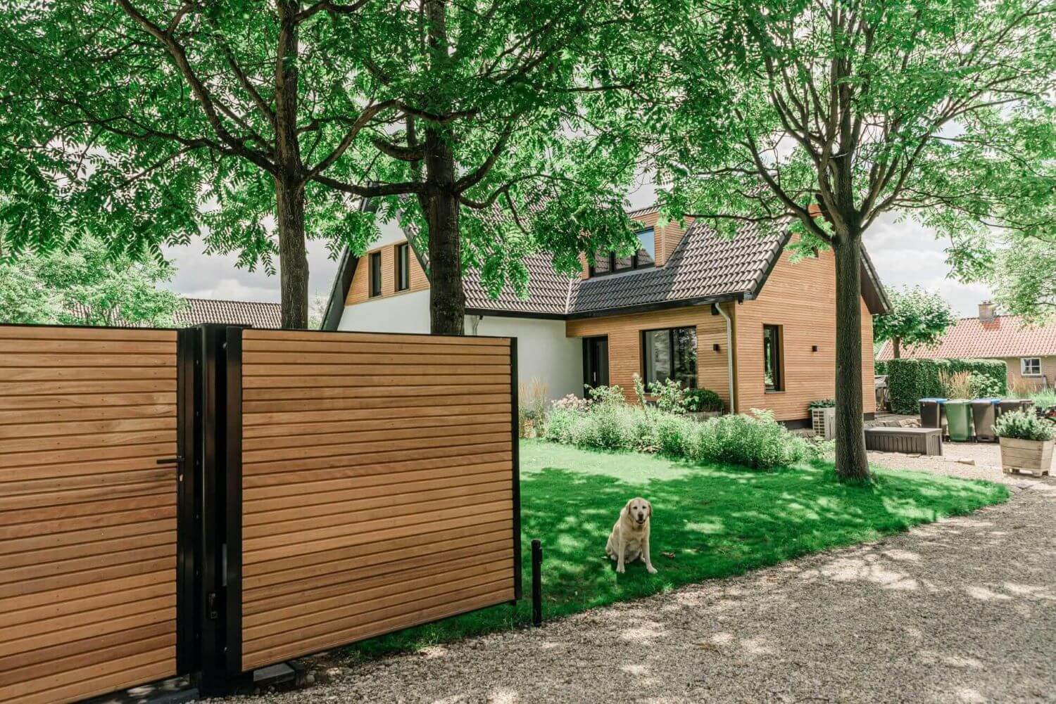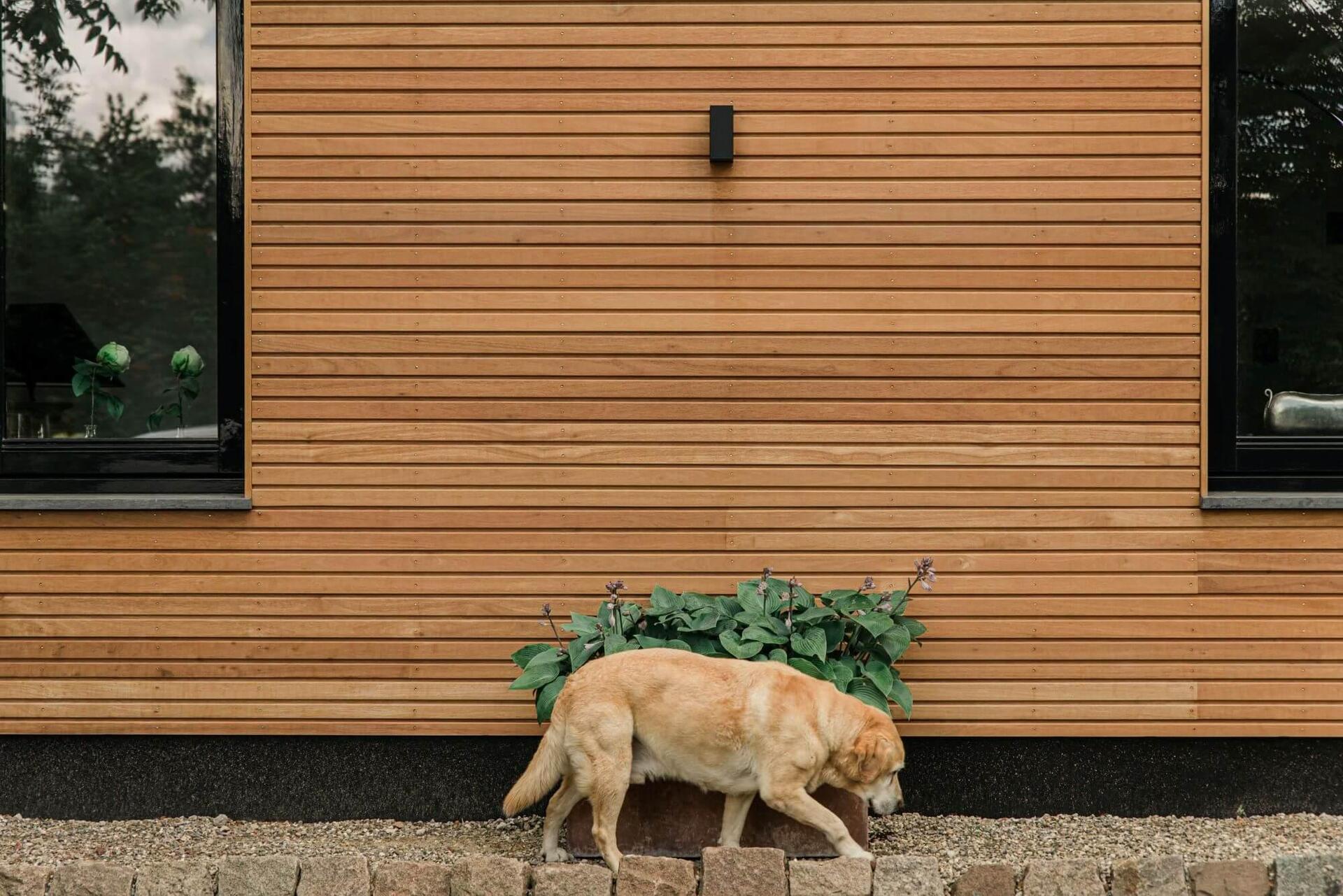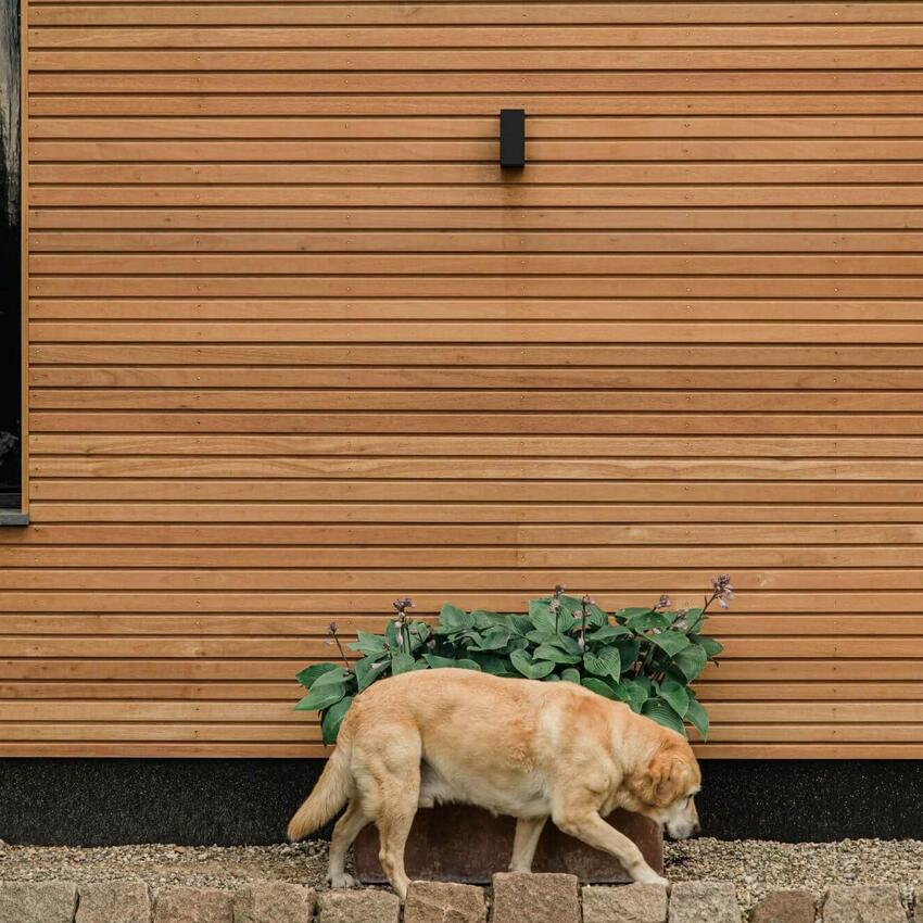 Louro gamela is stable and durable (class 1-2) and is often chosen for facade cladding of residential or commercial buildings. At the moment the wood is still red-brown, but the residents would like to let the wood age. For this reason it was decided not to treat the Louro gamela wood. We expect that the facade cladding will turn a beautiful silver-grey within a year!