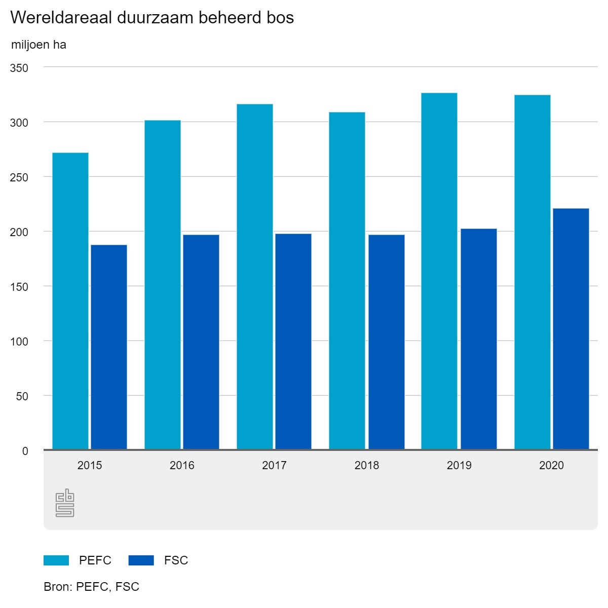 Duurzaamheid is hot, ook bij Nederlandse groothandelsbedrijven. In 2020 was maar liefst 93,7 procent van al het geïmporteerde hout (naaldhout, hardhout en plaatmateriaal) gecertificeerd (Bron: CBS). Dat was tien jaar geleden wel anders. Toen lag het aandeel van gecertificeerd hout nog rond de 70%. Maar hoe is het gesteld met de verhouding tussen FSC®-gecertificeerd hout en PEFC-hout wereldwijd? Volgens het Centraal Bureau voor de Statistiek (CBS) bedroeg in 2020 het totale areaal aan bos met een FSC®-certificaat 221,6 miljoen hectare. Met 324,6 miljoen hectare is het aandeel van PEFC een stuk groter (zie afbeelding 1). Het is daarbij goed om te weten dat een areaal meerdere keurmerken kan hebben.