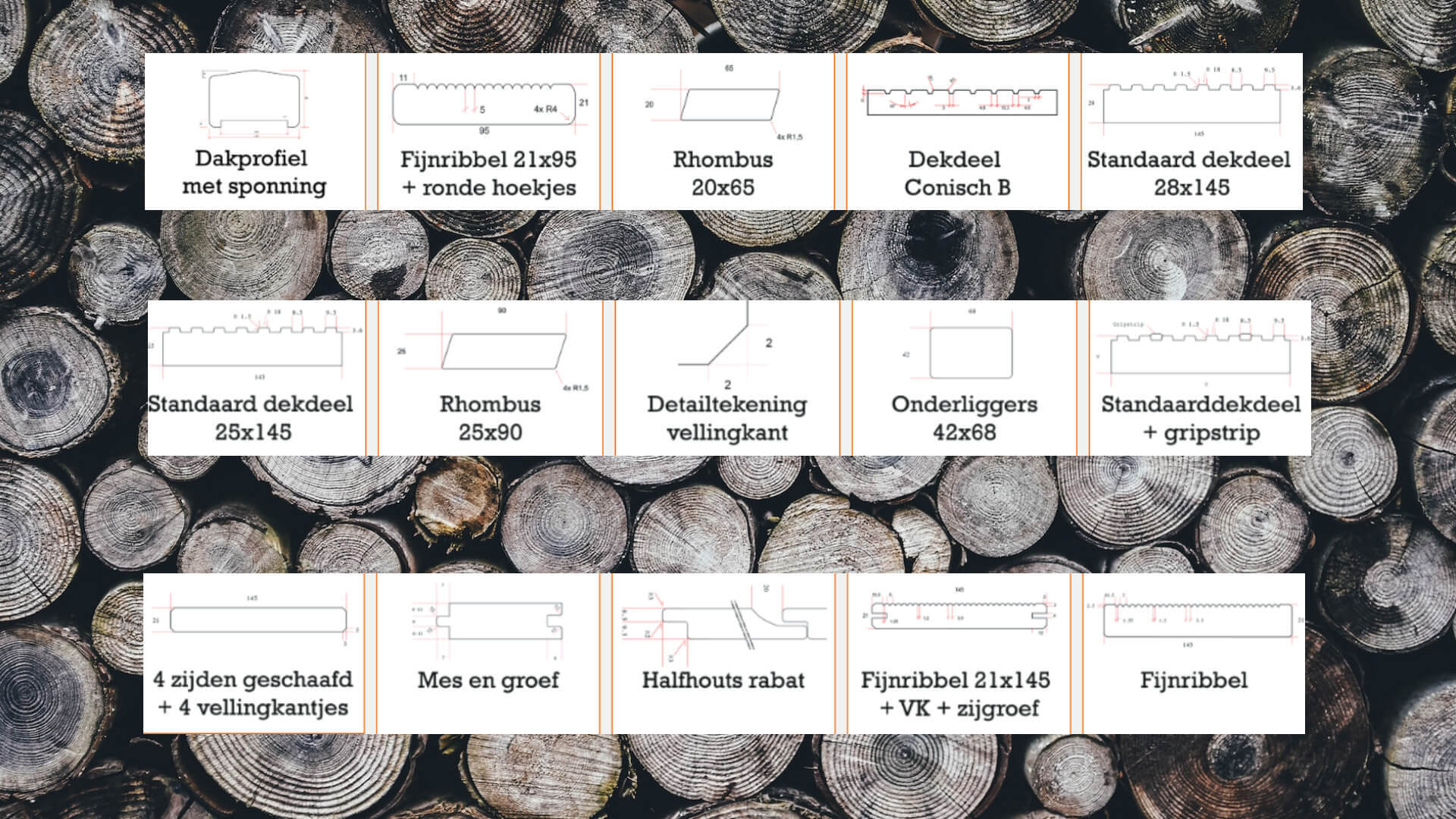 Juist omdat er zoveel mogelijkheden zijn, kun je gemakkelijk verdwalen in de hoeveelheid houtprofielen. Op rethinkwood hebben daarom wij een overzicht geplaatst van de meest voorkomende profielen van (tropisch) hardhout. Selecteer de categorie Profieltekeningen om deze te bekijken. Hieronder lichten we een aantal populaire houtprofielen kort uit.
