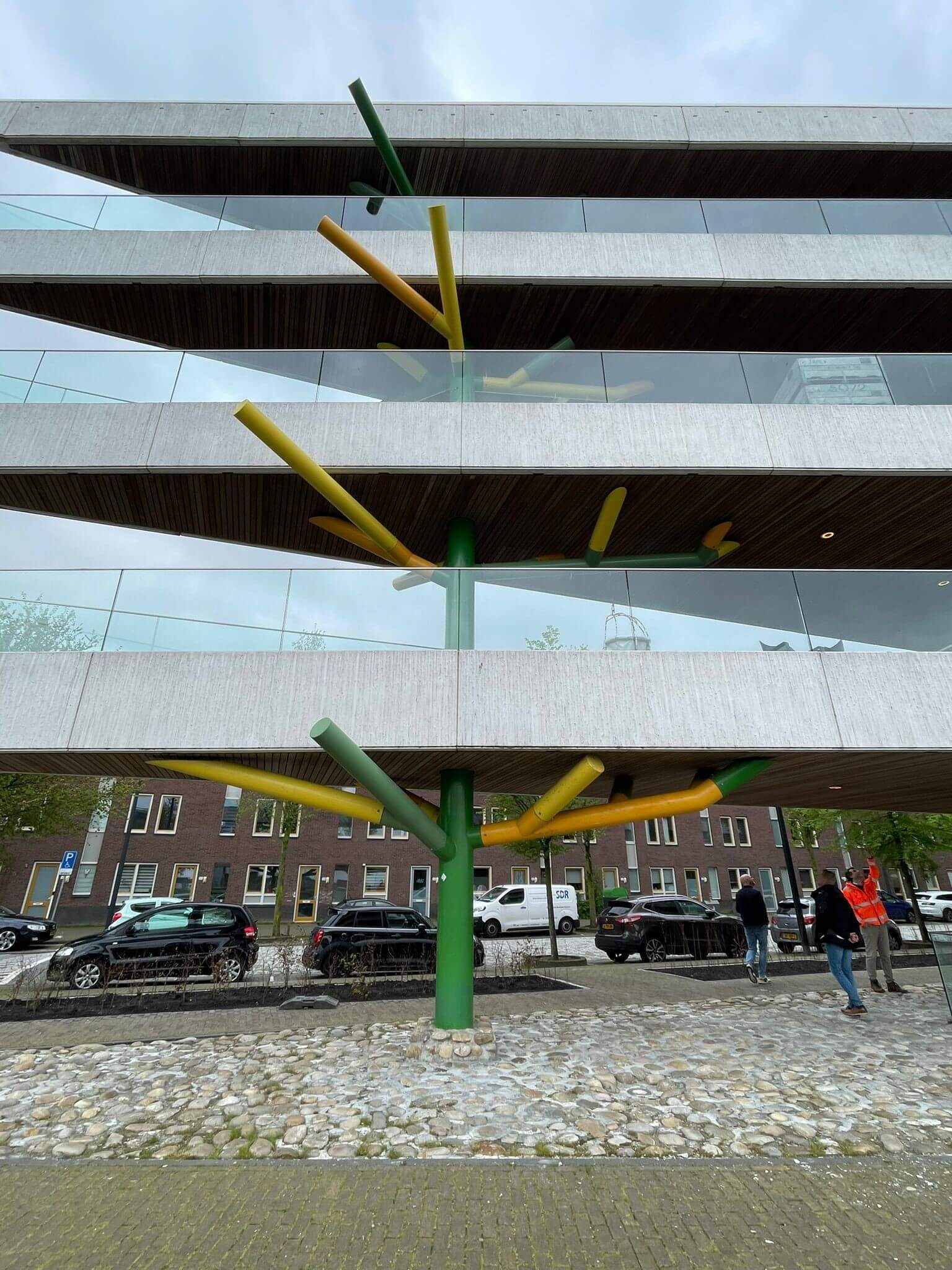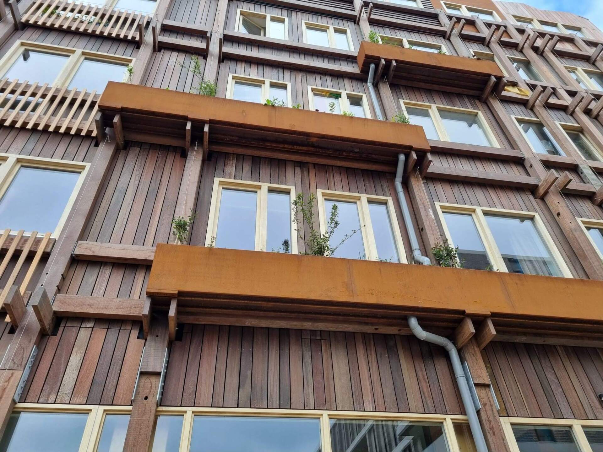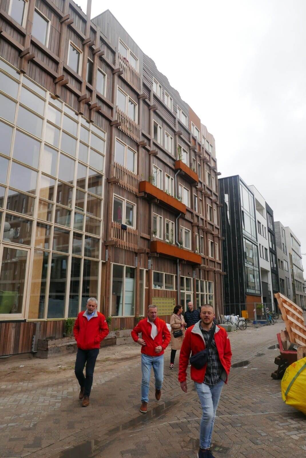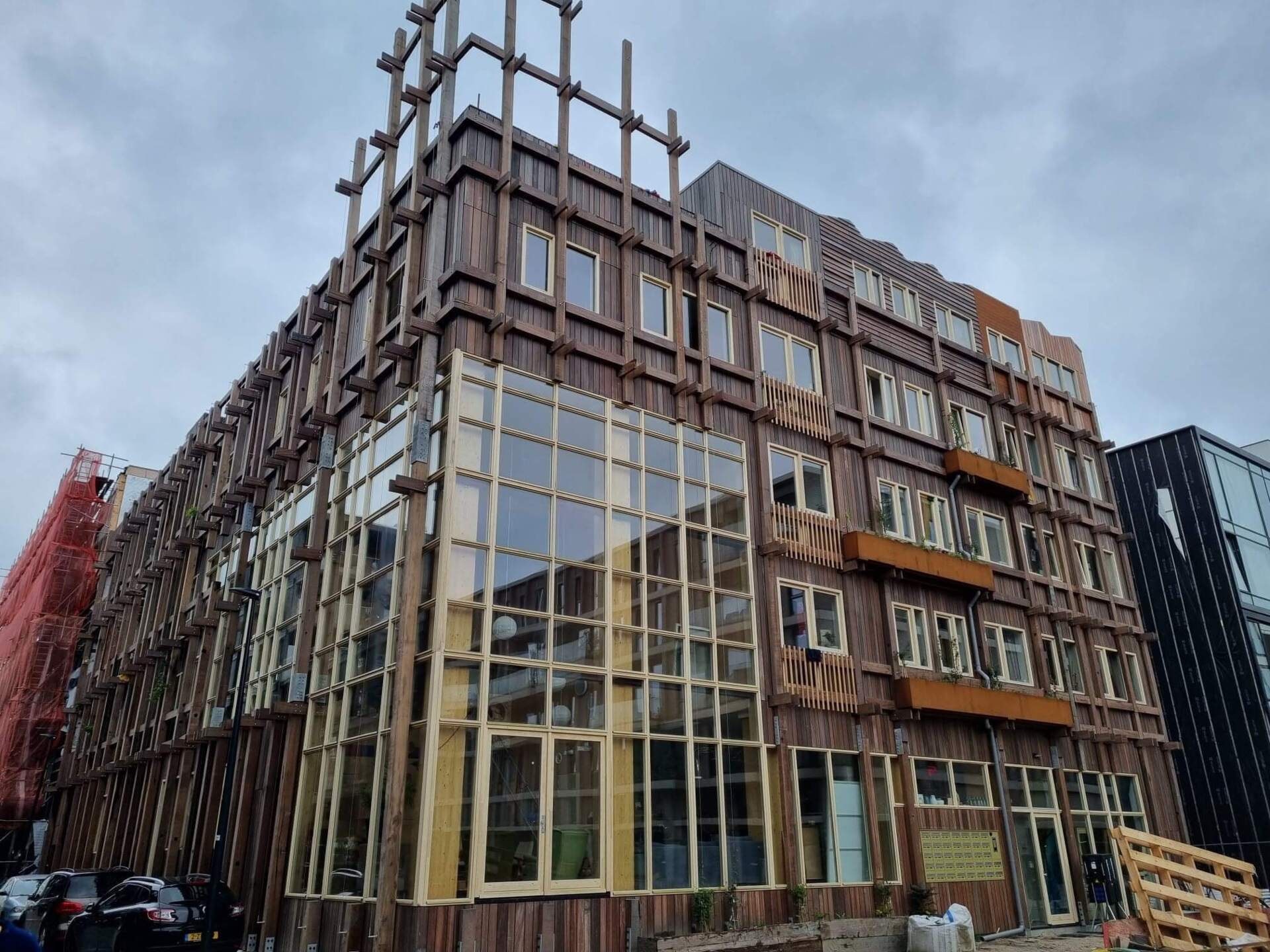 Opvallend was hoeveel hout er in deze wijk is gebruikt. Amsterdam is erg ambitieus als het om duurzaamheid gaat en wil ten minste 20% van alle nieuwbouw met hernieuwbare materialen bouwen. Rondom De Warren was dit goed zichtbaar. De houten gevels en CLT gebouwen waren dominant in het straatbeeld.
