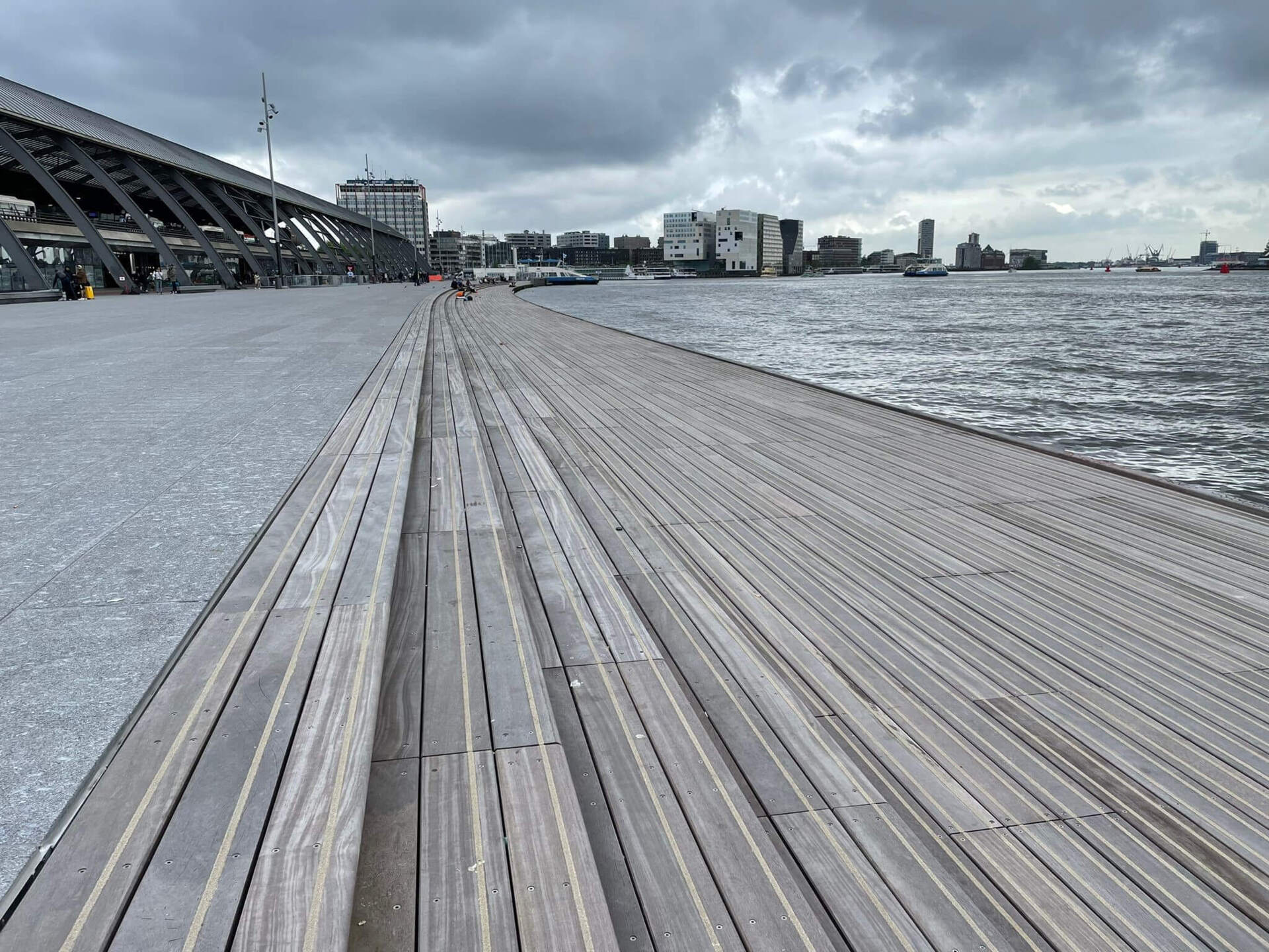 We sluiten onze excursie af bij Amsterdam Centraal. Vanaf een afstandje zien we de vlonder aan het water liggen waarvoor wij hout hebben mogen leveren. De vlonder is 5 tot 6 meter breed en een paar honderd meter lang. De toegepaste houtsoort is Azobé. Door zijn gunstige eigenschappen en hoge duurzaamheid (klasse 1-2) wordt deze houtsoort uit tropisch West-Afrika veelvuldig gebruikt voor steigers en damwanden. Door de weersomstandigheden heeft de vlonder een zilvergrijze kleur gekregen. Op het moment van bezichtigen lijkt de IJvlonder één geheel te vormen met de bewolkte lucht.