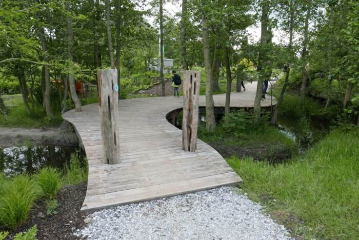 Floriade brug hergebruikt hout Nr: 27092022-09 Hergebruikt hout van FSC-hardhout voor brug wereldtuinbouwtentoonstelling Floriade. Azobé Bilinga Acariquara Brug Vergrijsd