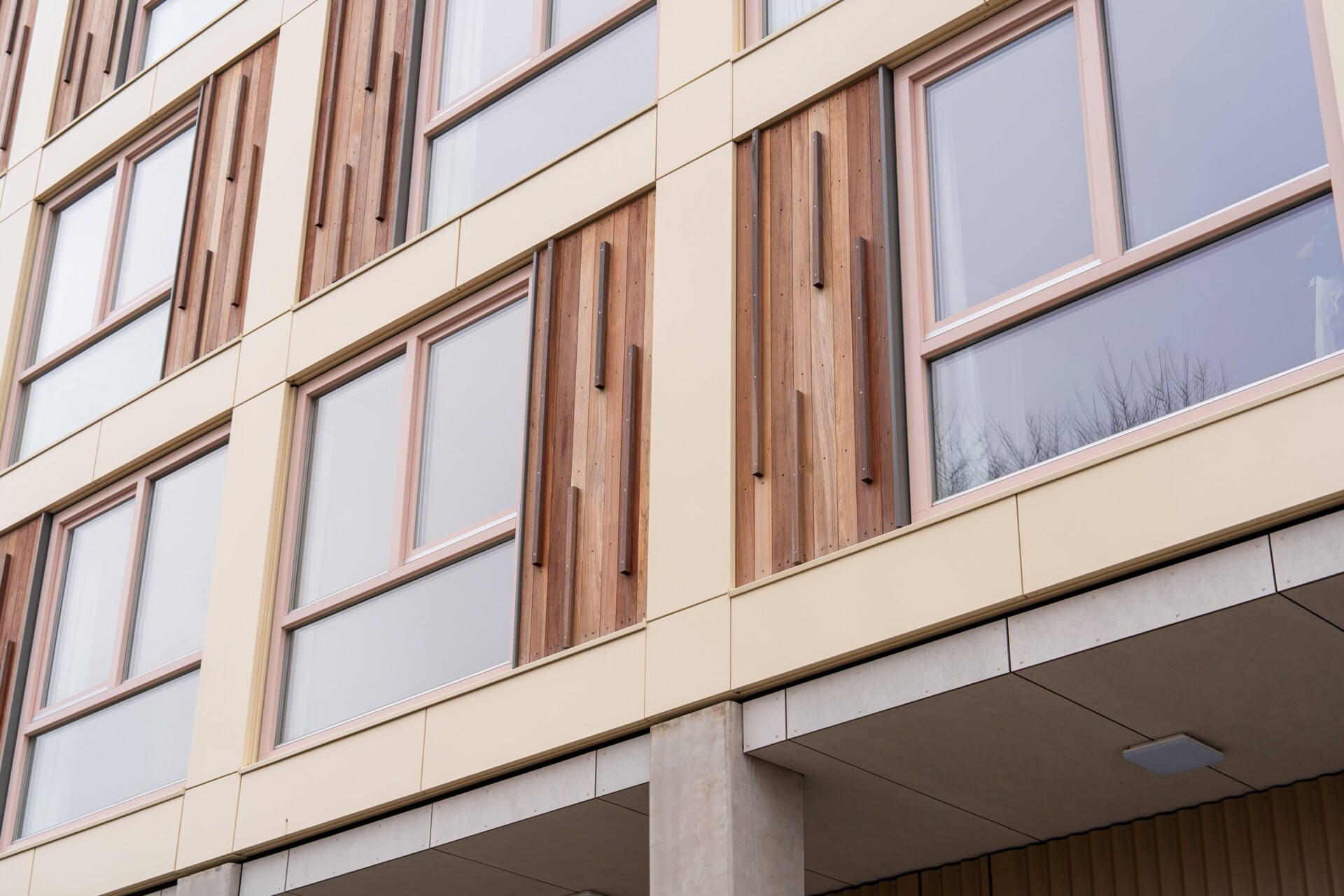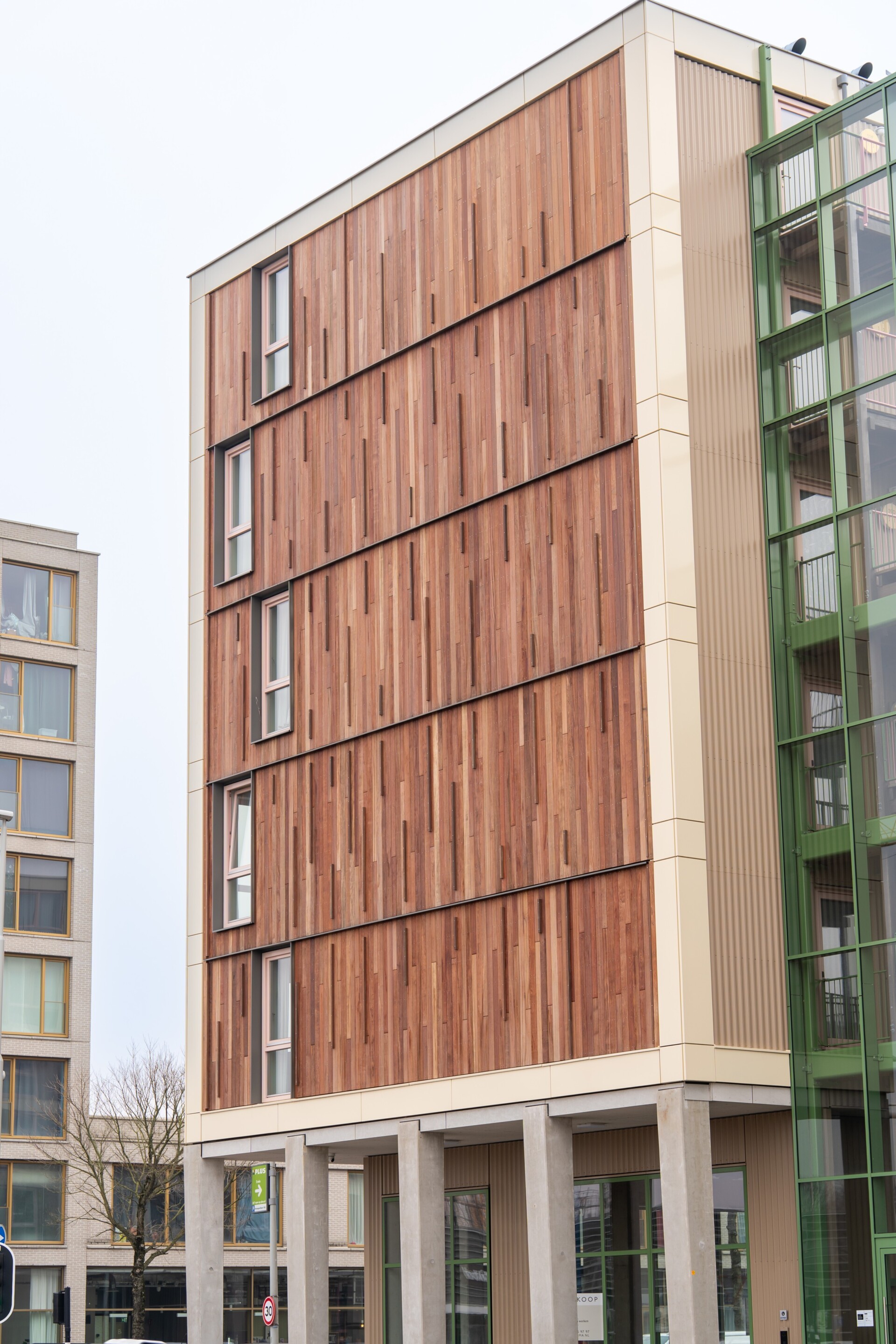 Een bijzonder kenmerk van Poppies is de houten gevel, die voldoet aan brandklasse B zonder gebruik van brandvertragers of complementaire materialen. Deze unieke oplossing toont de kracht van 100% onbehandeld tropisch hardhout. Van den Berg Hardhout heeft het hout geleverd, waarbij na uitgebreid overleg is gekozen voor een combinatie van onbehandeld Jatoba en hergebruikt Azobé. Het hout is door Van den Berg Hardhout gedroogd en geschaafd, waarna ApHoutconstructies de prefrabicage heeft uitgevoerd, zoals het boren van gaten en het op maat afkorten. Prince Cladding Obdam heeft vervolgens de houten gevel geplaatst. Dankzij deze nauwe samenwerking is het gelukt om, ondanks de tijdsdruk, een hoogwaardig resultaat te realiseren waar alle betrokken partijen trots op zijn.
