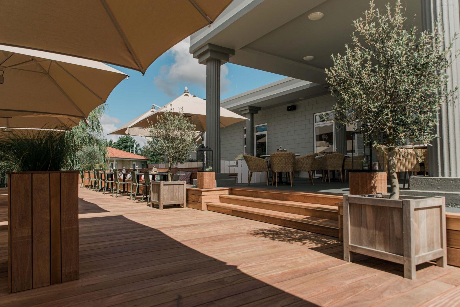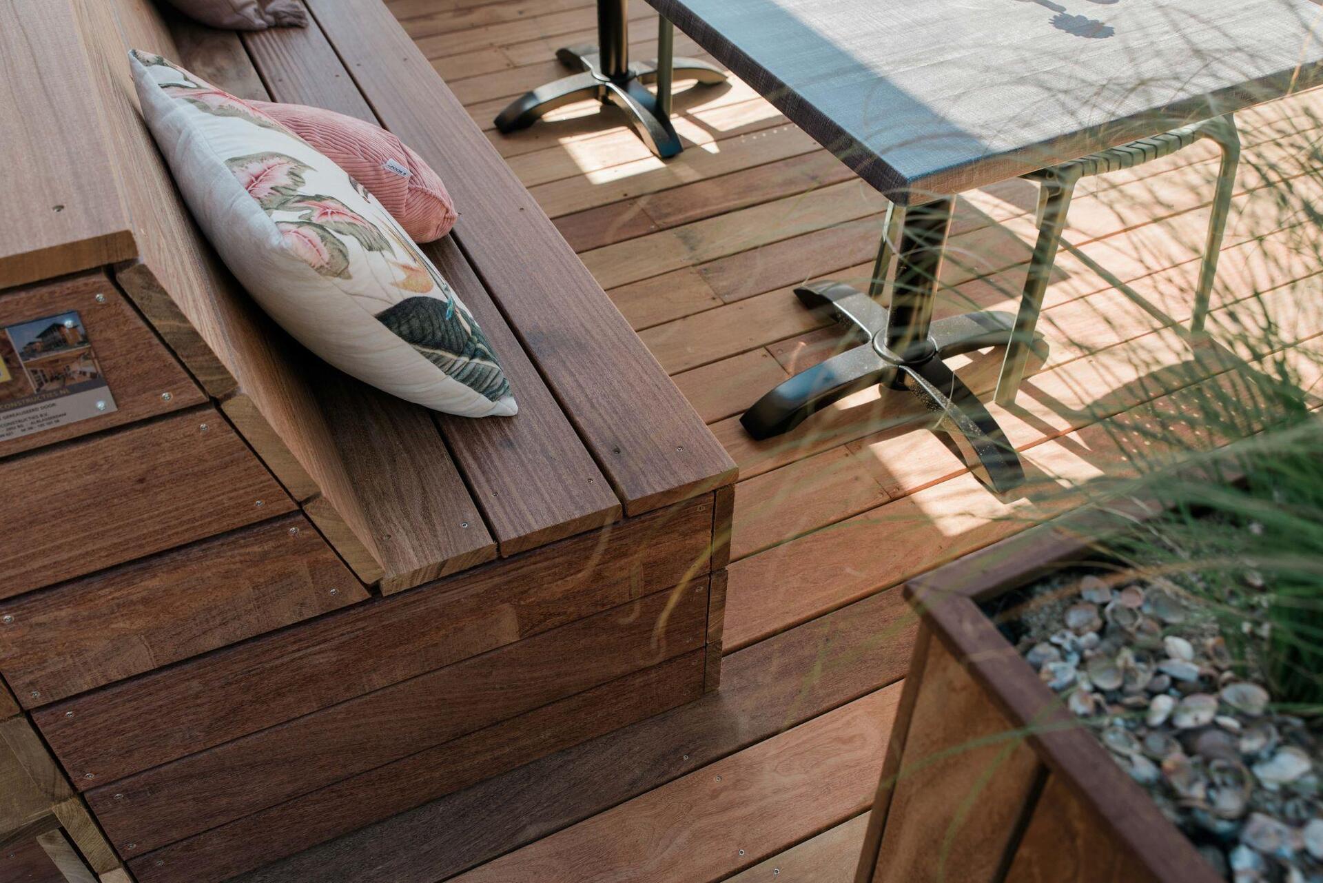 De styling van het terras was volledig in handen van ECLECT, onder leiding van interieurontwerper Liselore Hell. Dit bedrijf ontwerpt en realiseert interieurs voor woonhuizen, vastgoedprojecten en (horeca)bedrijven. ECLECT zorgde met de meubels en accessoires voor een warme uitstraling en een passend geheel. De inrichting laat het Cumaru terras goed tot zijn recht komen. Met het oog op duurzaamheid, is ook resthout toegepast. Zo zijn de planten- en prullenbakken gemaakt van Upcycled Wood. Upcycling is niet alleen een milieubewuste keuze, het geeft het Cumaru terras ook een unieke en speelse touch!