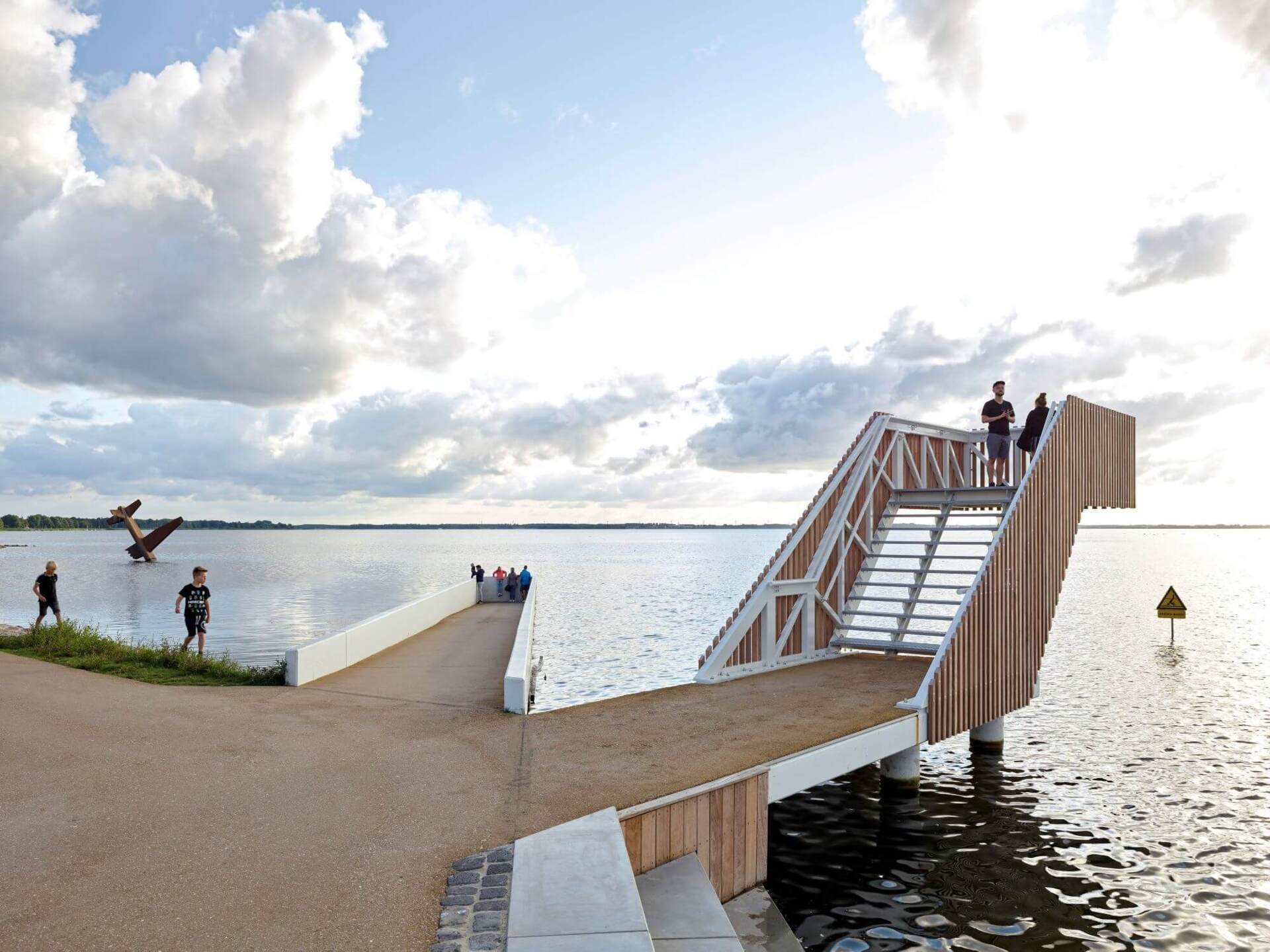 Aan het begin is een grote vlonder gecreëerd die tegelijk terras, podium en ontmoetingsplaats is. Hij zet zich voort als loopvlonder langs de waterkant. Ook voor de uitkijktoren en een brug is hout aangeleverd. Tezamen benadrukken ze de belangrijke rol die dit natuurmateriaal altijd in en bij het water heeft gespeeld, ja zelfs de identiteit van ons land heeft meebepaald. Waterwerken zonder hout? Dat is buitenland!
