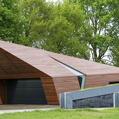 Het dak en de gevelbekleding zijn gemaakt van Ipé hout. Ipé is afkomstig uit Tropisch Midden- en Zuid-Amerika en heeft een vrij gelijkmatige structuur zonder uitgesproken tekening. Kenmerkend van Ipé is het bijzondere Rhombus profiel. Bekijk hier de handige infographic van Ipé hardhout.