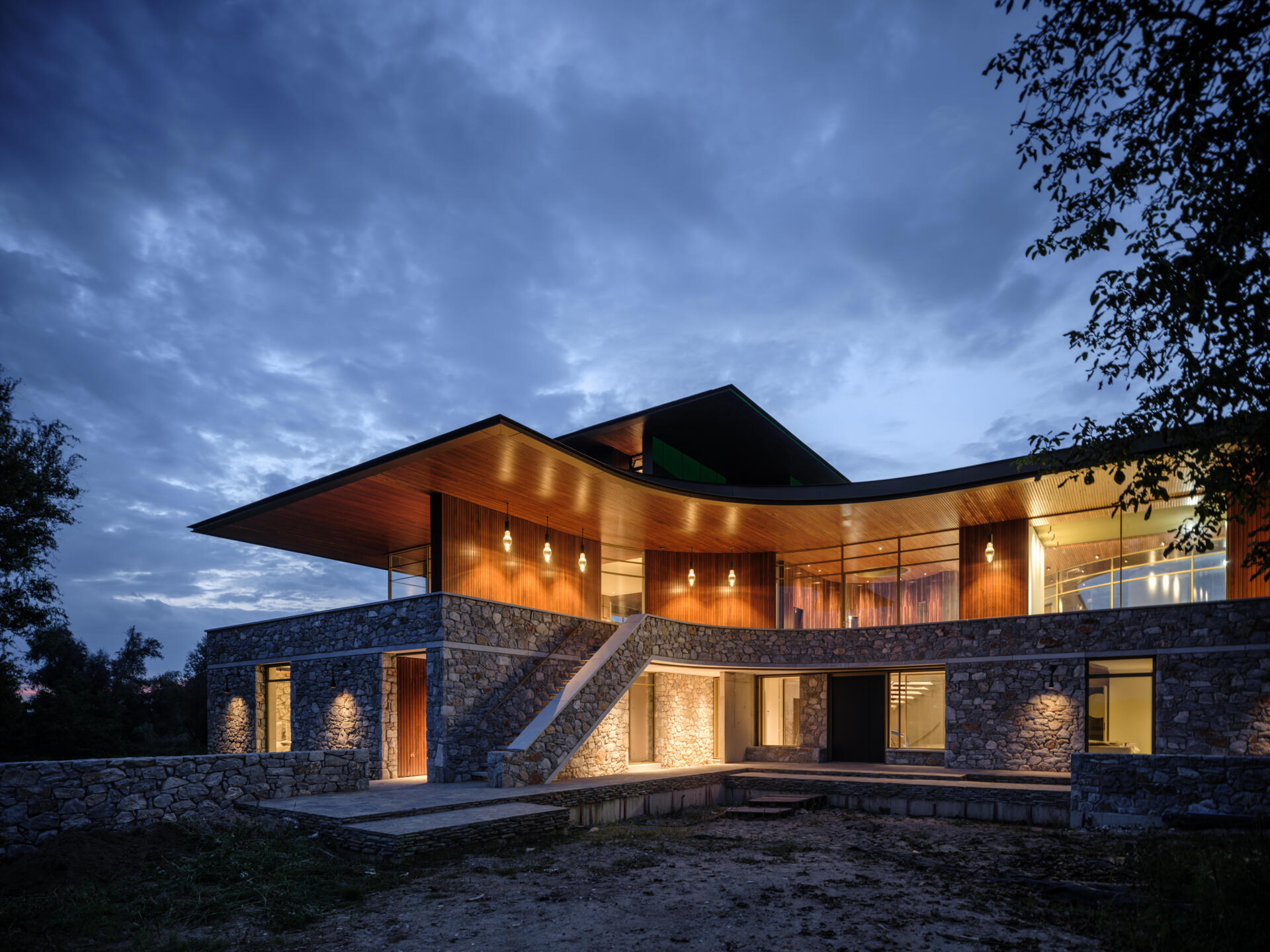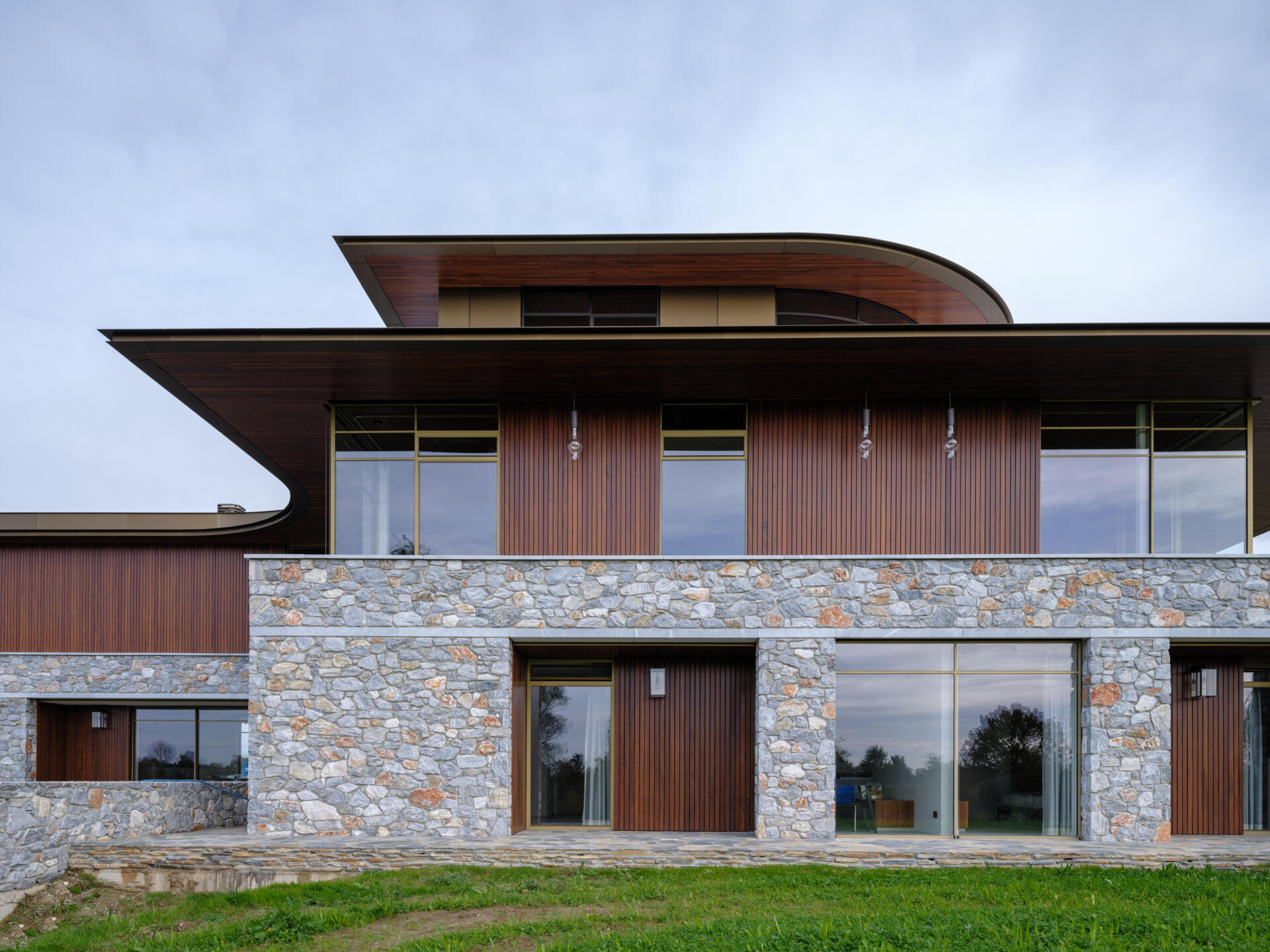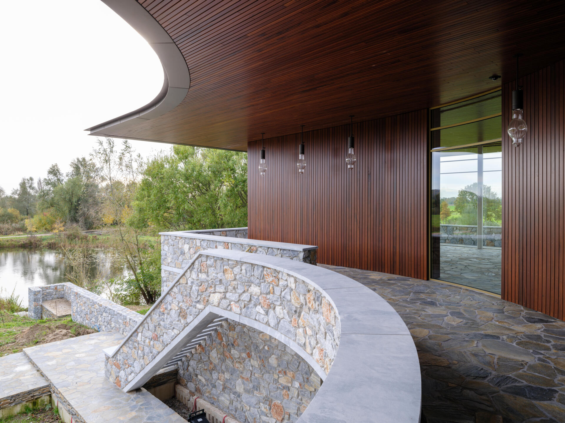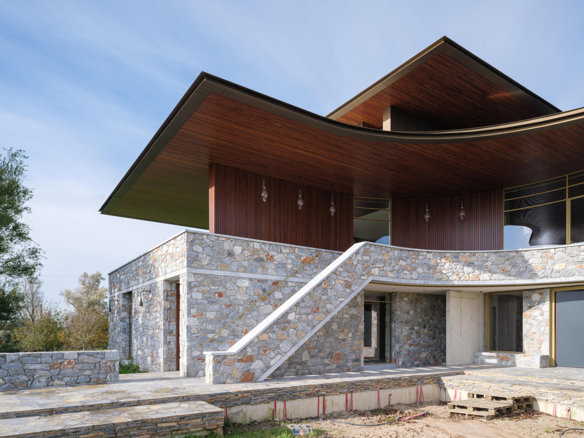 Midden in het rivierengebied van Oost Nederland staat sinds 2023 een nieuwe blikvanger. Dit moderne landhuis kijkt uit over een plek waar landschappen elkaar ontmoeten. Idyllische landweggetjes, omringd door vennen en houtwallen leiden naar een heuvel die de basis voor dit landhuis vormt. Het gebruik van natuursteen in combinatie met de Muiracatiara gevelbekleding en plafonds geven het landhuis een robuuste, maar warme uitstraling die opgaat in de omgeving.