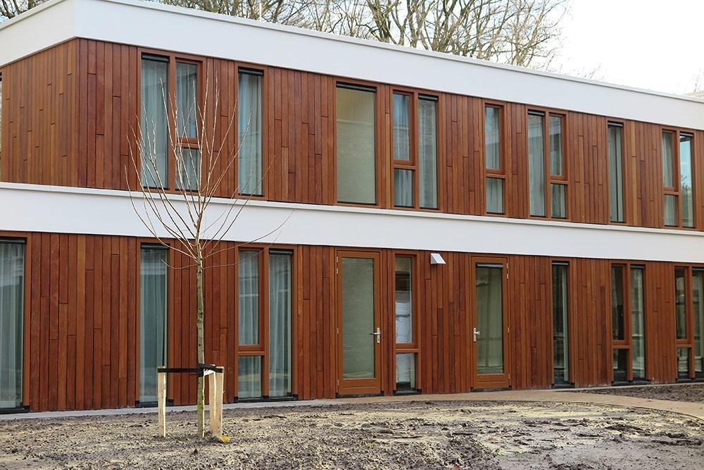 Mandioqueira / Sucupira amarela hout zie je vaak terug in schuttingen, vlonders en tuinmeubelen. In het geval van Nieuw Hydepark is het hoogwaardige hardhout gebruikt voor de gevel en de kozijnen. De Sucupira amarela gevelbekleding steekt prachtig af tegen het witte stuc, ruimte raampartijen en betegeling.
