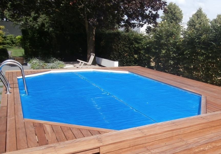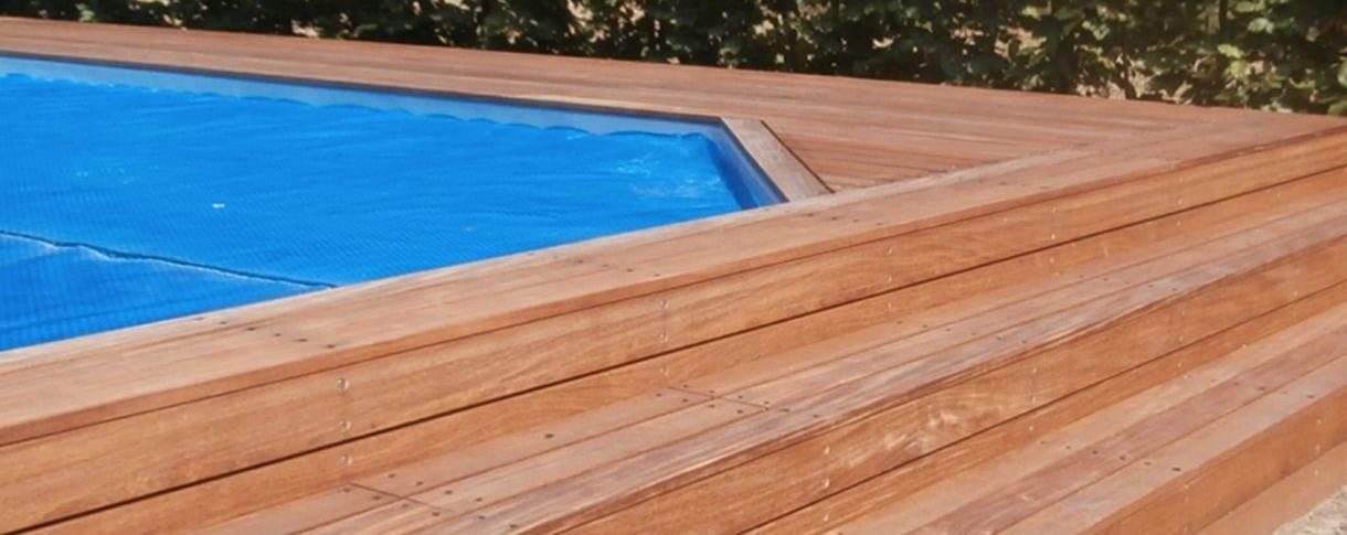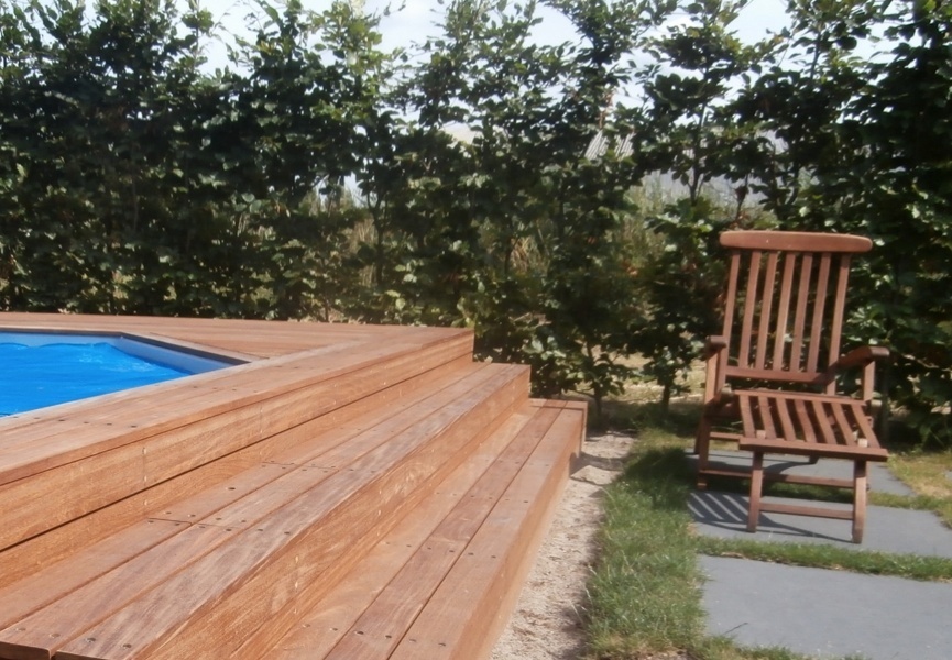 Ombouw rond zwembad inclusief trap en dek. Gebruikte houtsoorten zijn: Ipé (dek), Walaba (palen),Fava Amargosa (liggers)