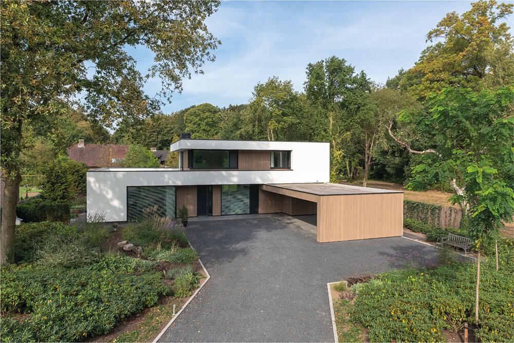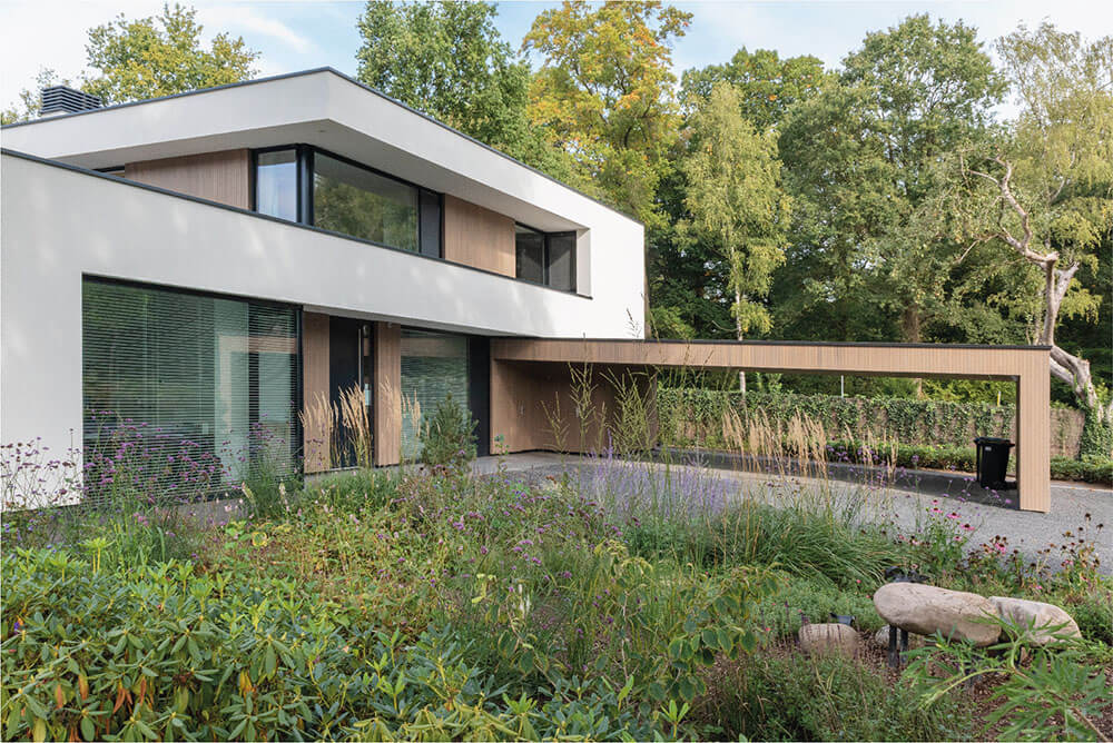 Aan de rand van het dorp staat sinds kort een prachtig vormgegeven villa. De opdrachtgever was opzoek naar een houtsoort die naast mooi, er ook robuust uitziet; en zich goed laat beitsen. Er is hier gekozen voor een lage pigmentering grijs waardoor het Basralocus hardhout mooi tot zijn recht komt.