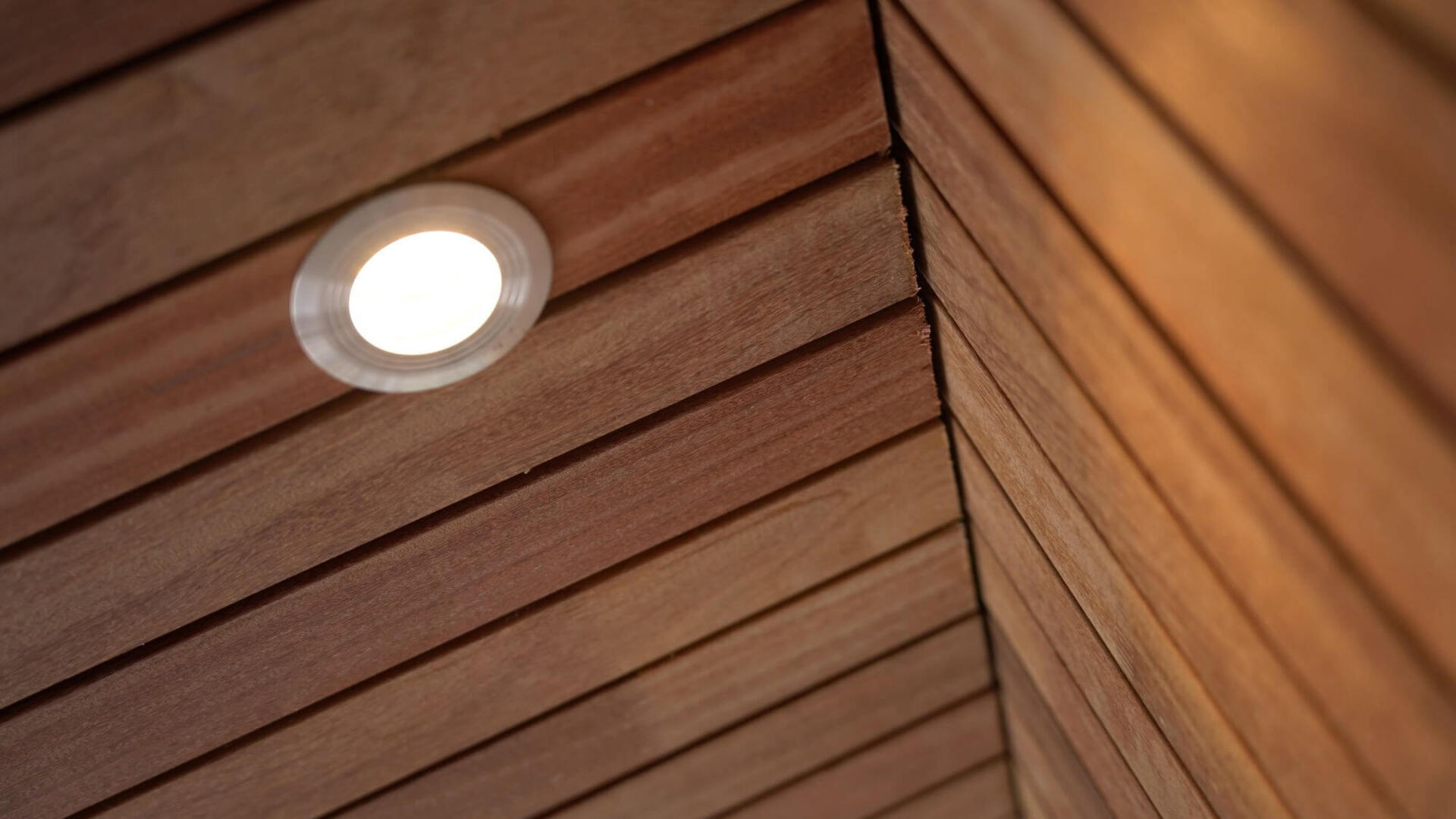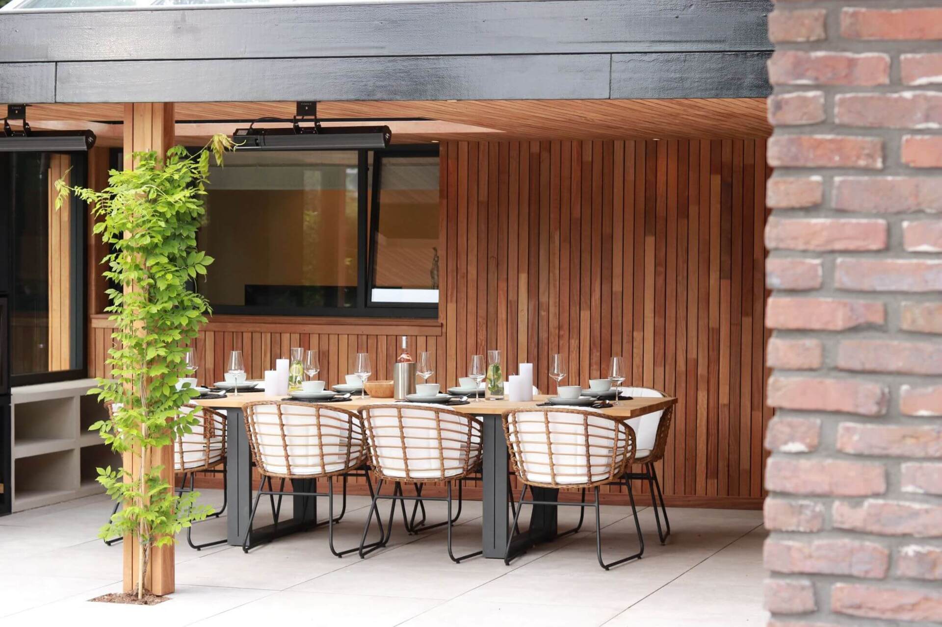 Voor de luxe villatuin in Naarden is een overdekt terras gerealiseerd. Het terras moet een fijne plek worden voor de bewoners om uitgebreid te lunchen of te dineren. Als tegenhanger van het ‘blonde’ Cumaru hout adviseerde Van den Berg een duurzame hardhoutsoort met een warme tint: Tauari Vermelho. Tauari Vermelho is een stuk minder bekend dan Cumaru, maar doet wat kwaliteit betreft niet onder voor de ‘alleskunner’. Aan de gevel van de woning en op het plafond van de terrasoverkapping zijn smalle planken van Tauari Vermelho gemonteerd, in verticale richting. Voor het nodige licht in de avonduurtjes is de overkapping voorzien van spotjes.