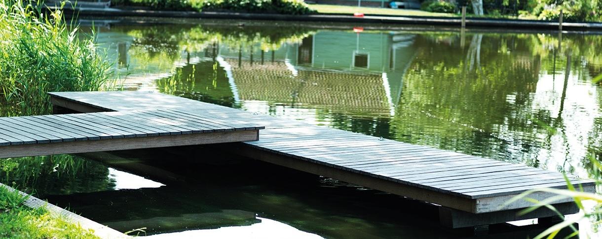 Massaranduba heeft vele toepassingsmogelijkheden en is uitermate geschikt voor waterbouwkundige constructies, bruggen, vlonders en tuinhout. Hier toegepast als steiger onder de rook van Amsterdam, in het schilderachtige Zuiderwoude.