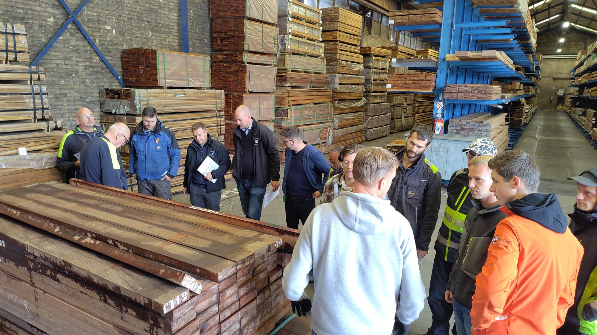 Werknemers van Van den Berg Hardhout, UVO Lopik en GWW Houtimport krijgen uitleg over het sorteren van loofhout volgens de NEN-EN 14081-1.